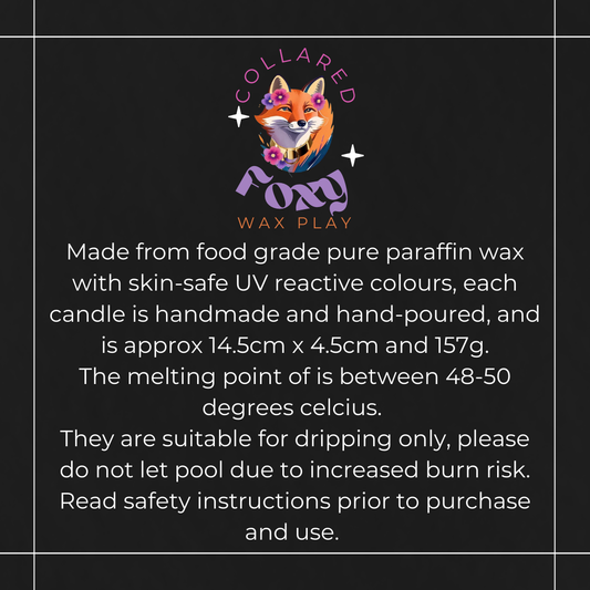 Our bespoke 100% paraffin recipe, with a temp of 48-50 degrees celcius, meaning you get a steady cascade of silky drips that cling, pool, and peel with just the right balance of spicy sting and the sensation of being engulfed in a warm hug.