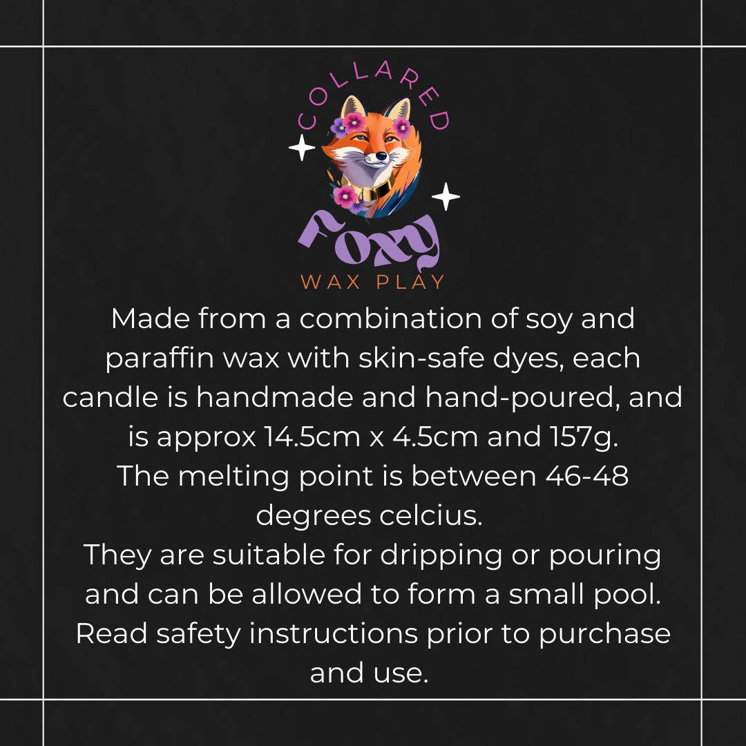 Collared Foxy pouring candles are created from a blend of soy and paraffin wax, coloured with skin-safe pigments. They are approximately 157g, 14.5cm high and 4.5cm in diameter. Due to the handmade and hand poured nature of these candles, these dimensions may vary and cosmetic imperfections such as rings, colour variation, minor settling and dye flecks may occur, which do not affect use.